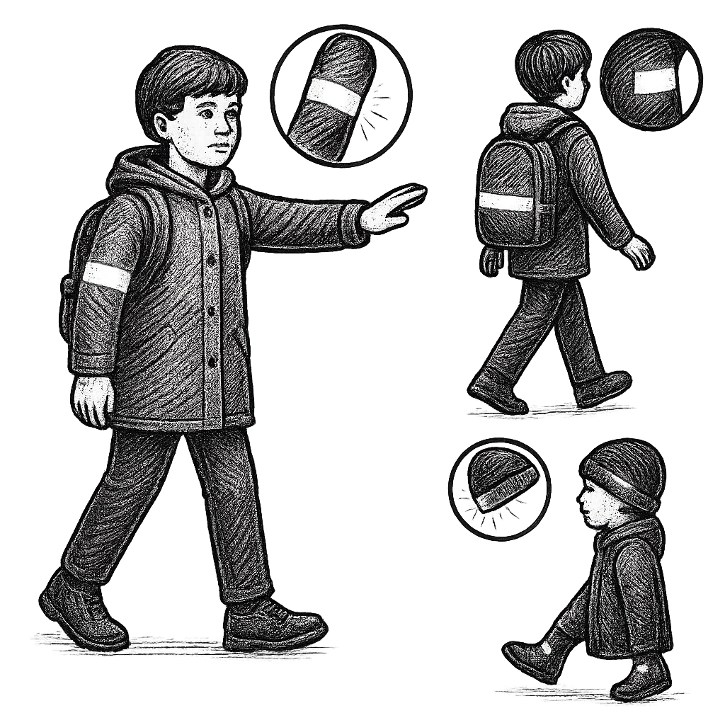 🟡 Noś odblaski po stronie drogi, od strony nadjeżdżających samochodów – na rękawie, torbie, lasce lub plecaku.