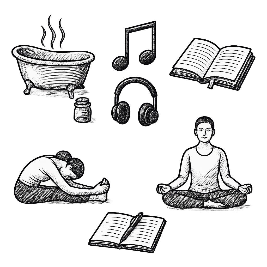 - Muzyka relaksacyjna lub dźwięki natury – obniżają poziom kortyzolu.